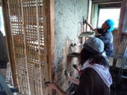 2回目は実際にエコキャビンをみなさんの手でかたちにしていきます。地元の技や自然素材を使った「土壁づくり土レンガづくり」ワークショップを行いました。土壁の小舞(こまい)の材料となる木の皮や土などの素材を用意するところからスタートし、地元の“達人”をお招きして、木の皮の向き方、土壁の塗り方など“その地にあるものを活かしていく”技を教えていただきました!