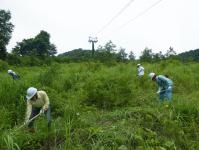 スキー場の跡地を森に戻すべく、植林した苗木を守る草刈り(=下刈り)を、