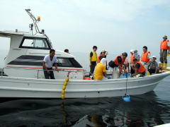 【漁船に乗り込んで、琵琶湖の水質、底質の調査法を体験します。陸上実習では、簡単な水質測定法、顕微鏡を使った琵琶湖の生物観察を体験して、琵琶湖の環境を科学的に調査します。また、研究室で行われている水質分析の実際についても解説します。】