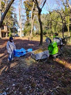 今回は、川を挟んで隣り合う睦沢小学校のフェンスに沿い増殖した竹(およそ20mほど)を伐採し、竹チッパー(竹粉砕機)でチップにし、それを広場の通路に巻く作業を行います。