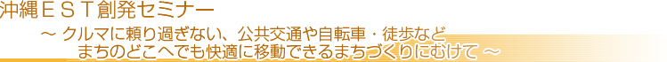 このセミナーでは、地球温暖化防止などに向けて、地方自治体や交通事業者、一般企業、市民団体の皆さまに、長期的な視野で環境改善を目指した交通対策を始めていただくことを期待し、2008なはモビリティウィーク&カーフリーデーと連携し、専門家などによるESTやモビリティウィーク&カーフリーデーの講演や参加者を交えた意見交換をおこないます。